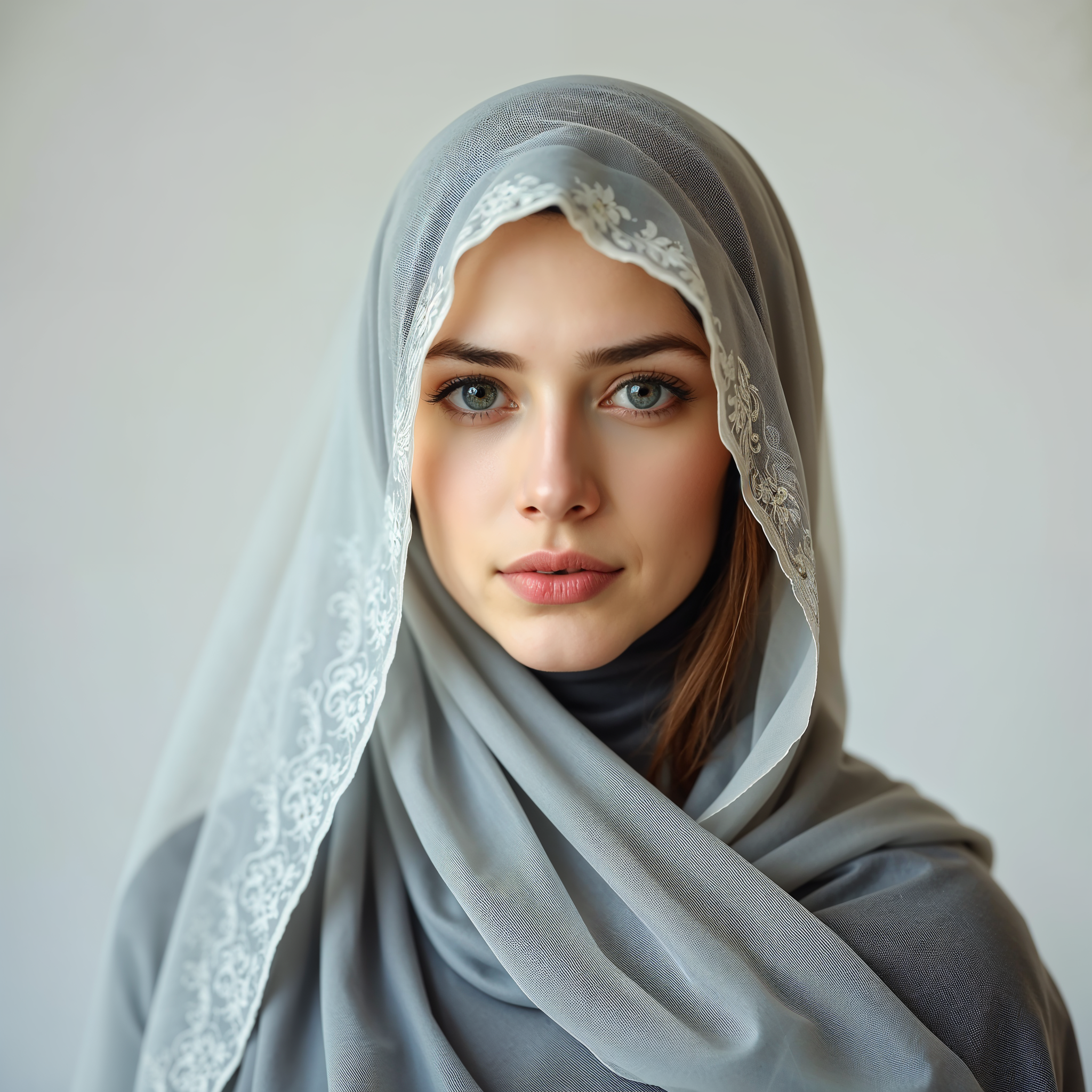 A young woman wearing a gray hijab with lace trim gazes directly at the camera, showcasing her striking features.