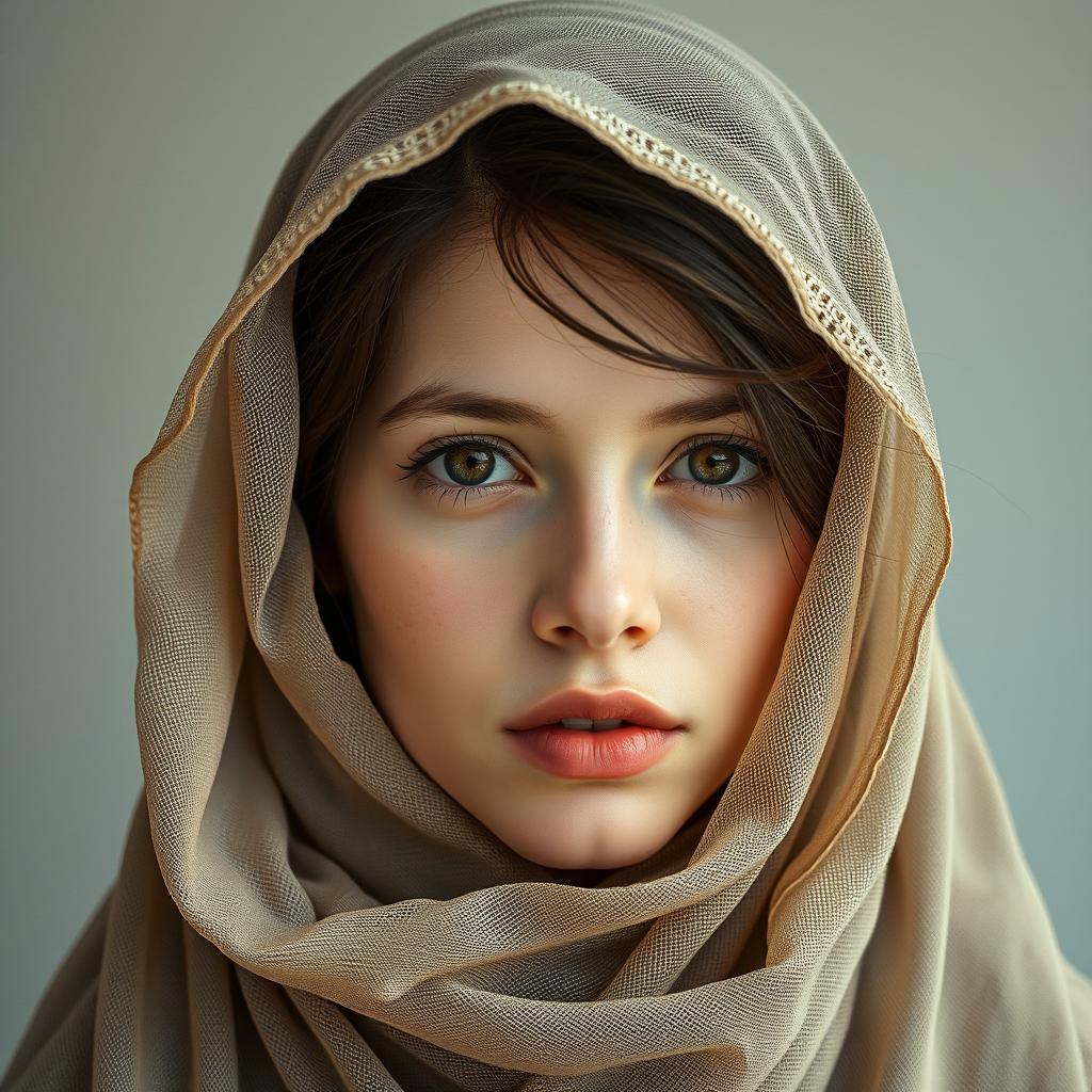 A young woman with striking features wears a neutral hijab, gazing softly at the viewer.
