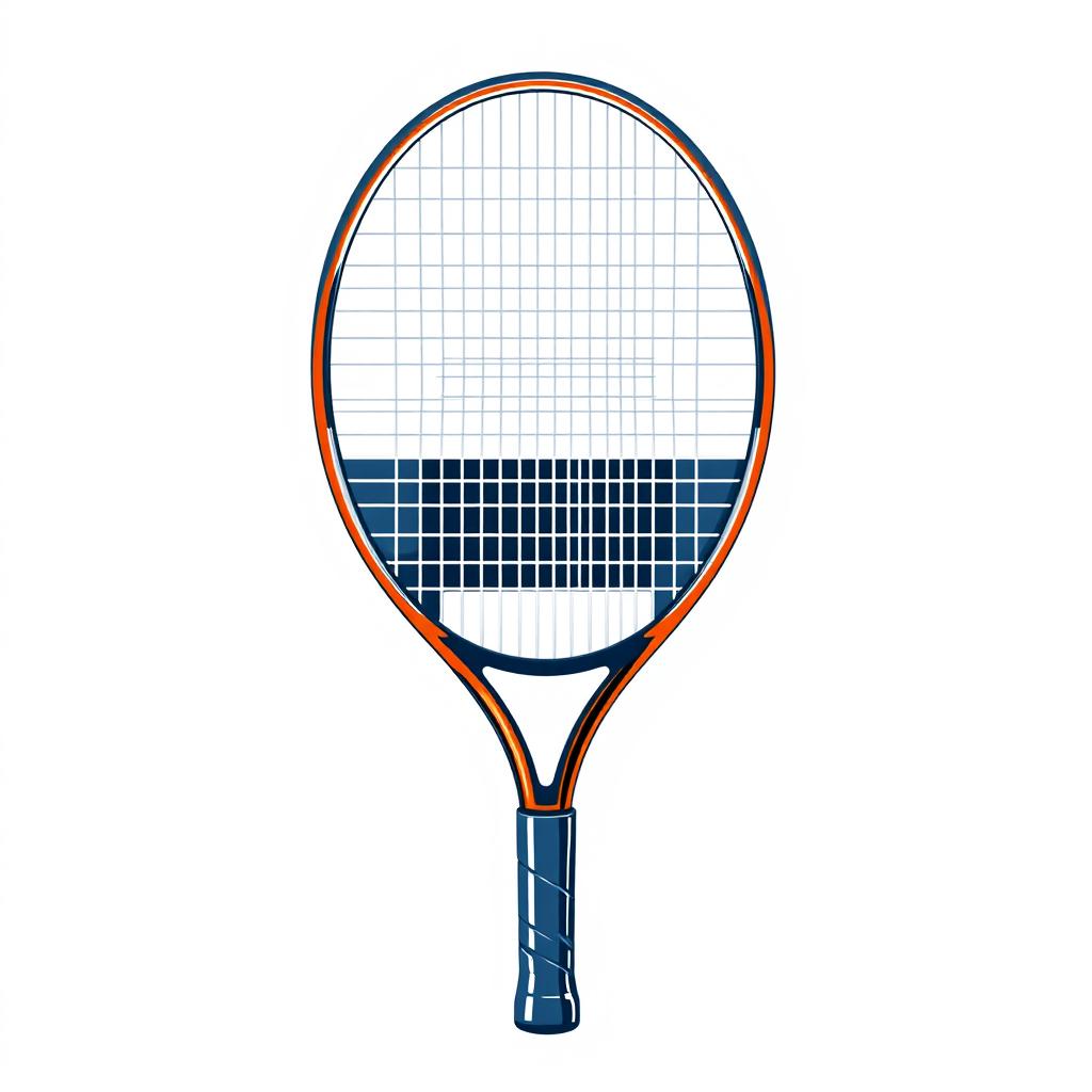 A detailed illustration of a tennis racket featuring a blue and orange design, highlighting its strings and grip.