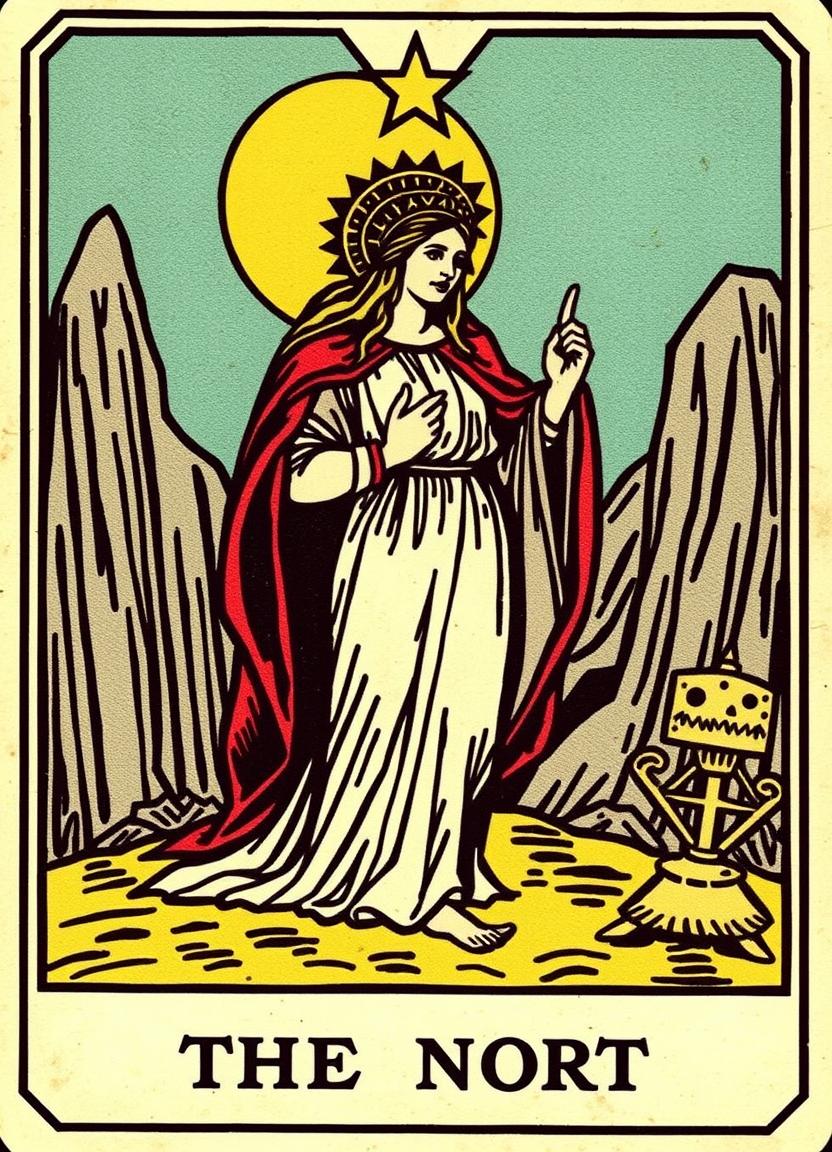A mystical woman stands in mountains, pointing upwards with the sun behind her, radiating confidence and strength.