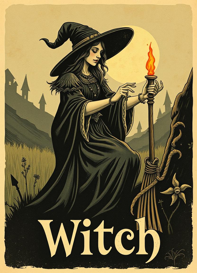 A witch in a flowing black gown conjures magic with a lit flame on her staff against a moonlit backdrop.
