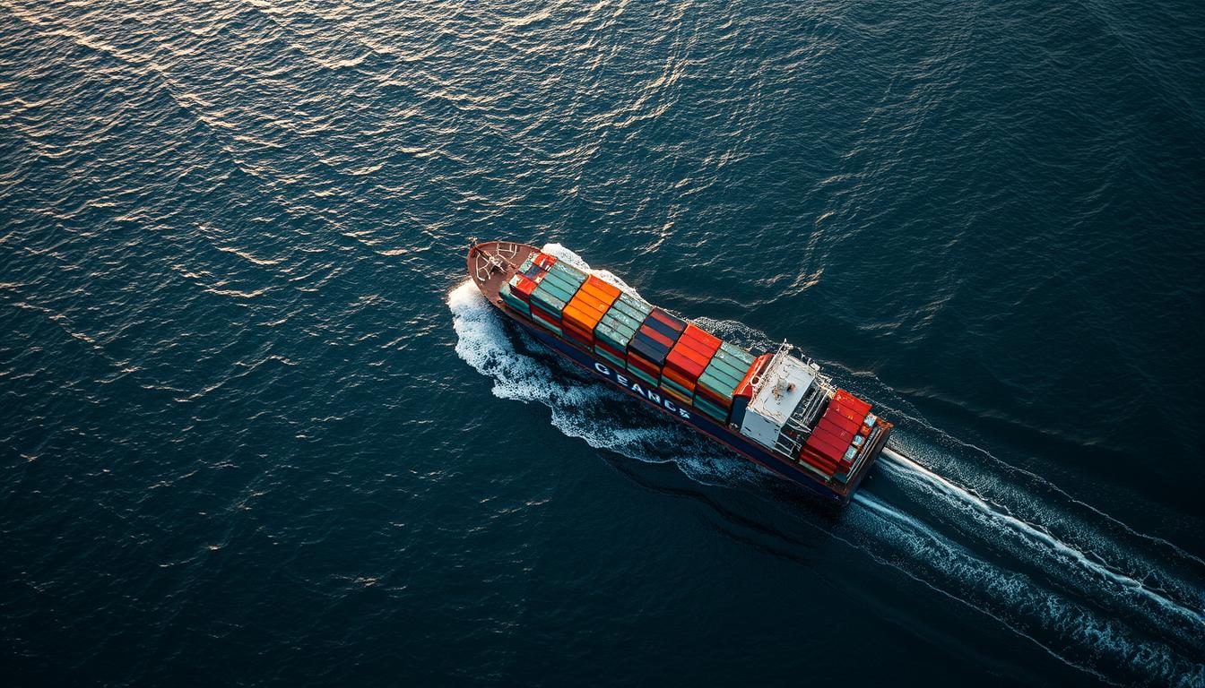 calm, cargo, container, dusk, freight, horizon, industry, logistics, maritime, navigation, ocean, sea, ship, shipping, trade, transportation, travel, vessel, wake, waters