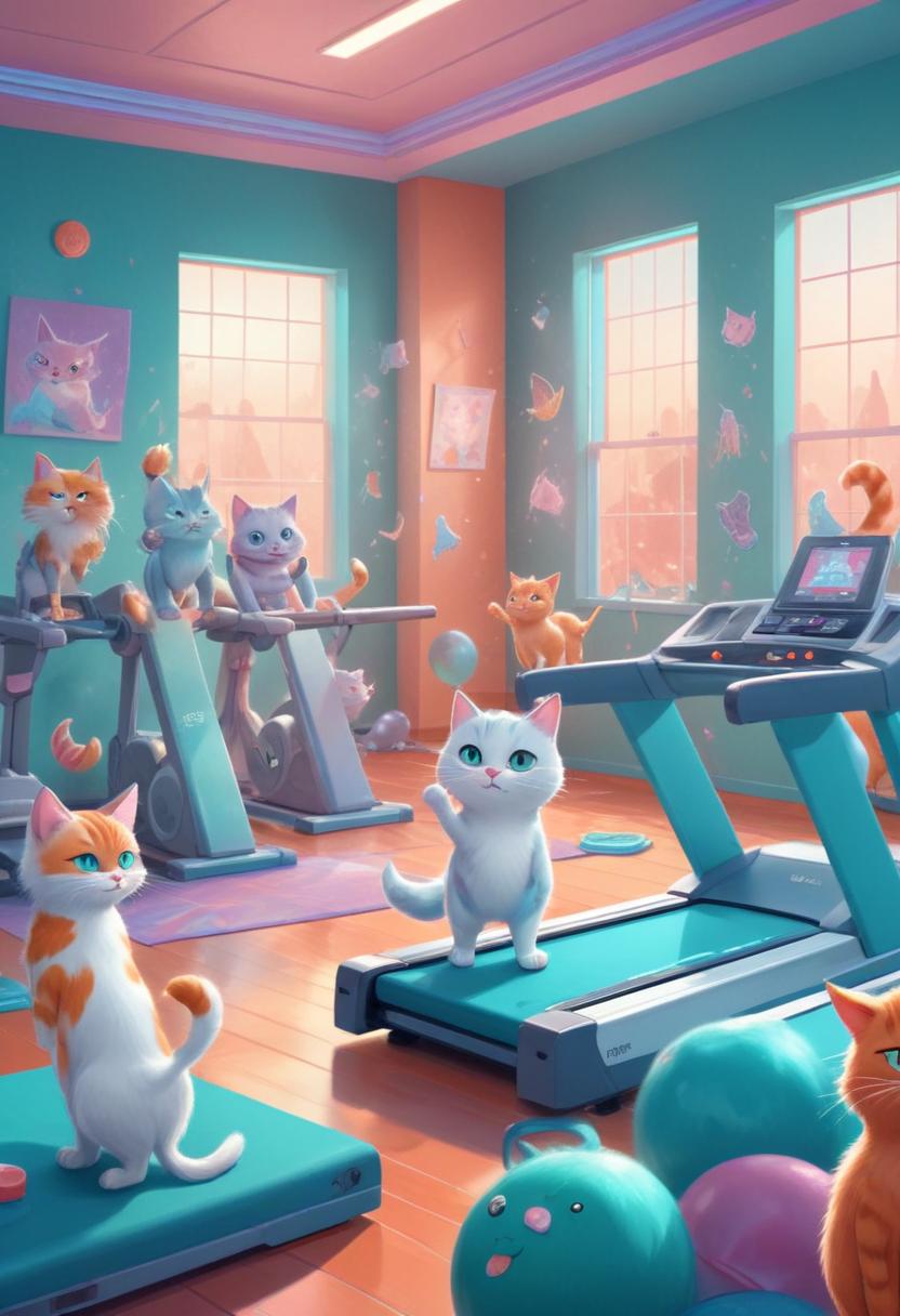 Cats engage in playful activities inside a vibrant gym filled with exercise equipment.
