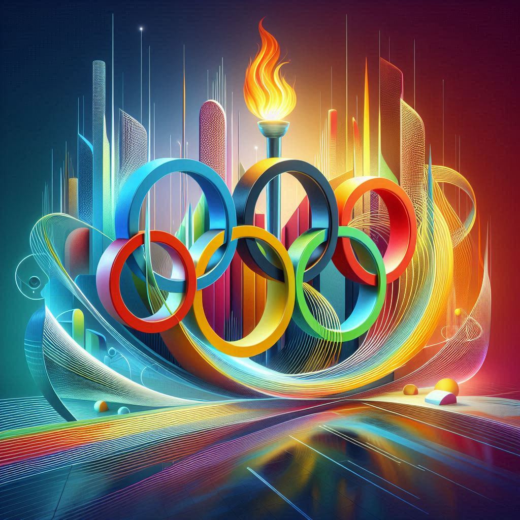Vibrant Olympic rings with a flame, set against an abstract colorful backdrop.