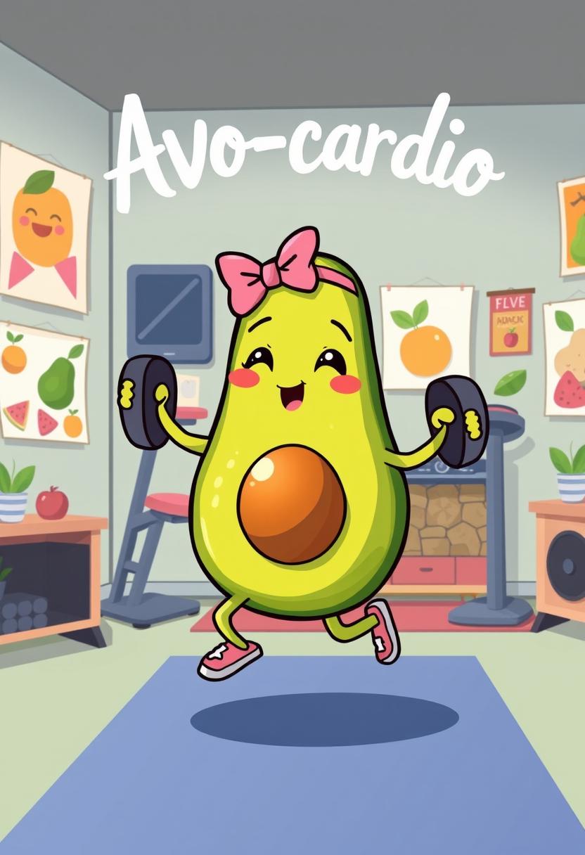 A cheerful avocado character lifts weights while working out in a bright, lively gym filled with fruit-themed decor.