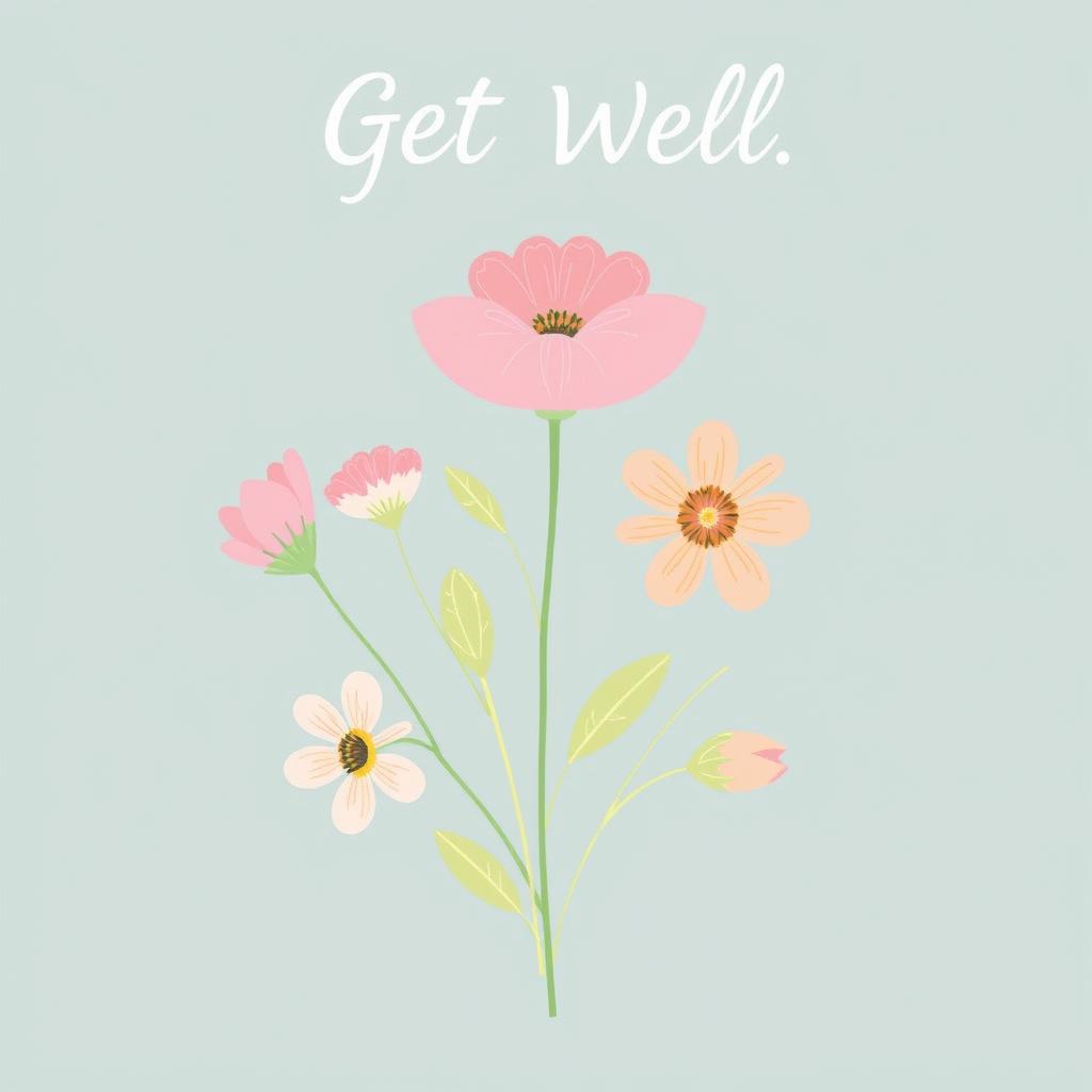 A blue background with a simple floral arrangement and the phrase Get Well.