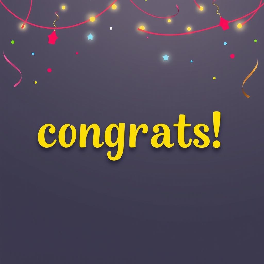 A purple background with the word congrats in yellow, with red string lights, confetti, and stars.