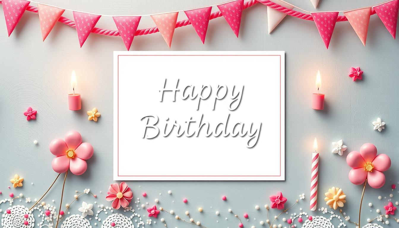 banner, birthday, candles, card, celebration, decorations, festive, flags, flowers, gray, greeting, happy, joy, love, message, party, pink, special, white, wish
