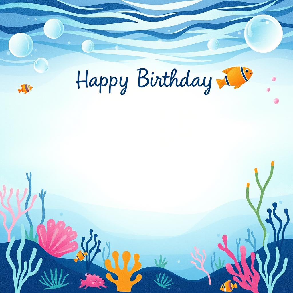A white background with the words Happy Birthday and colorful underwater imagery, including fish, coral, and bubbles.