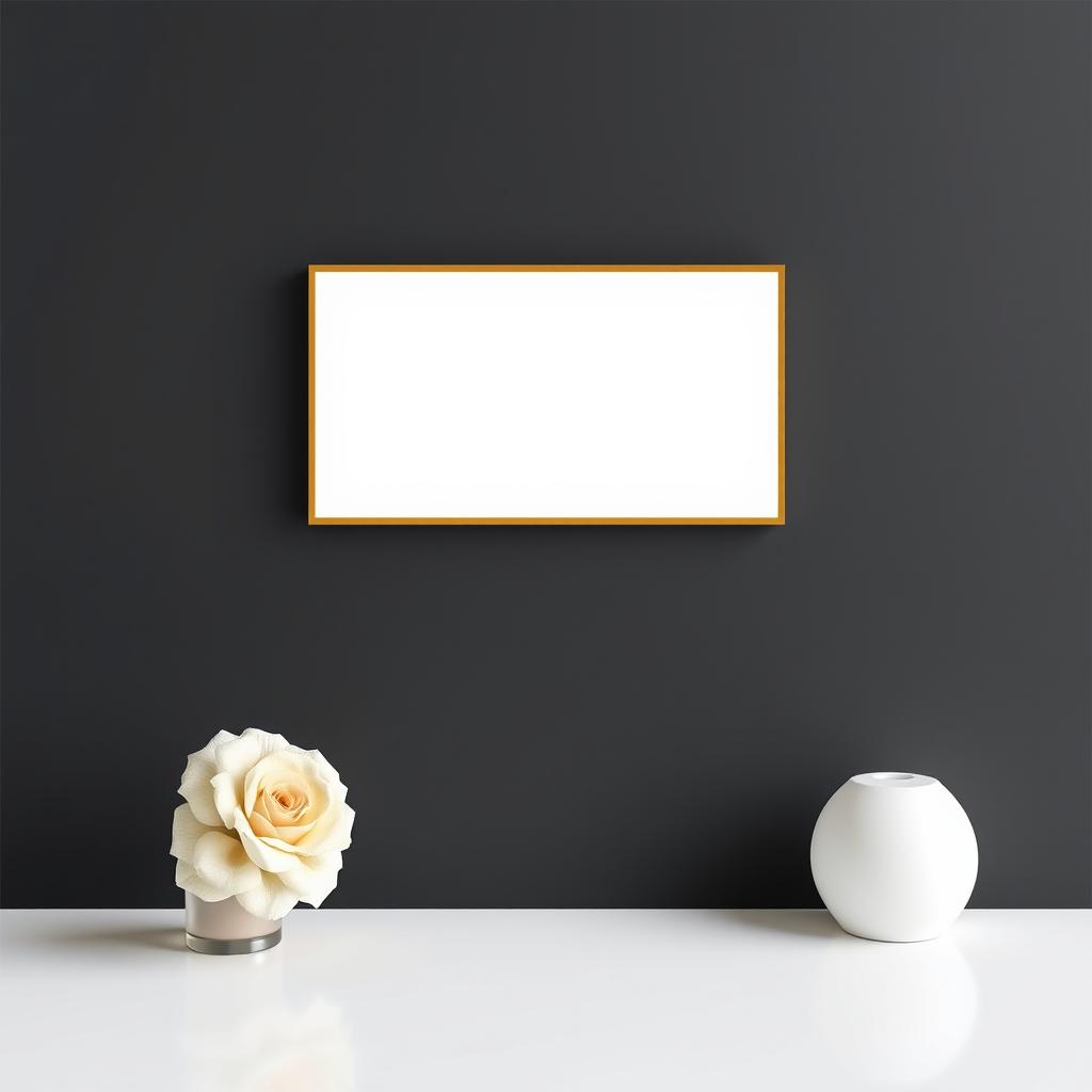 A white frame with a gold border hangs on a black wall. A white vase and a single white rose sit on a white table in front of the frame.