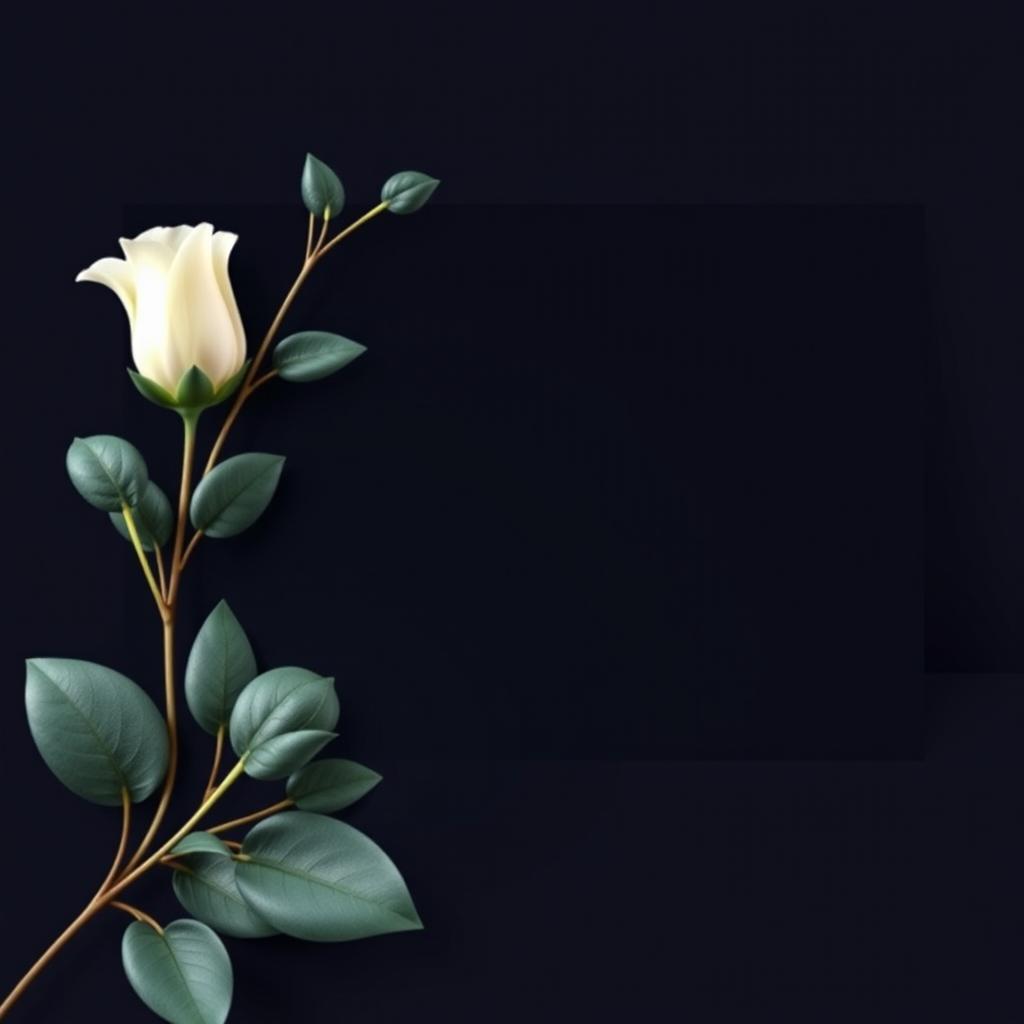 A single white rose with green leaves sits in the corner of a dark background.