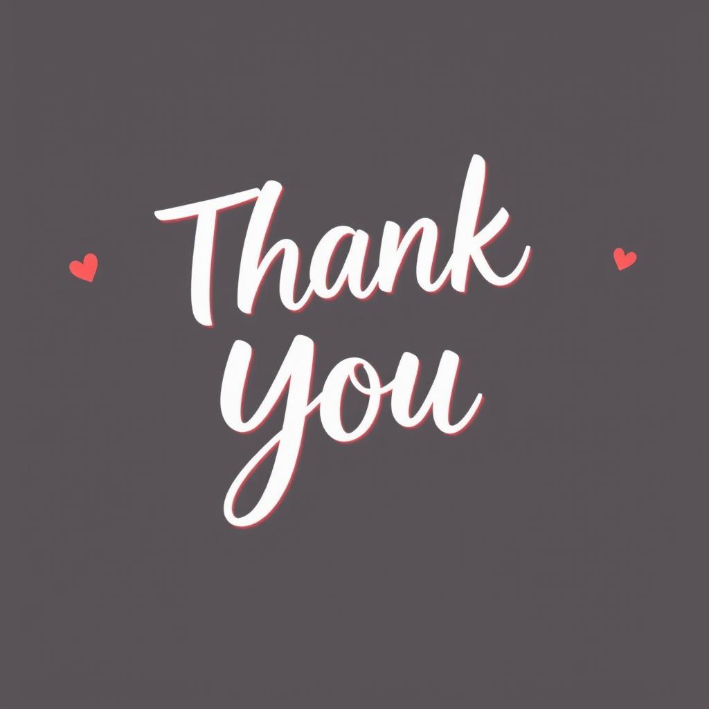 A simple thank you card with the words Thank you written in white cursive font and two small red hearts on a dark grey background.