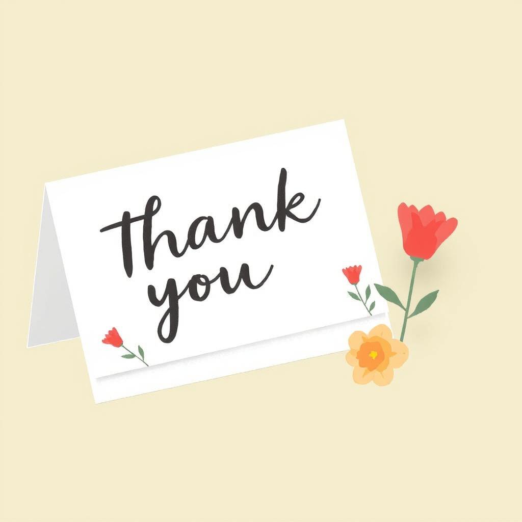A white card with the words Thank You written in black script and small red and yellow flowers.