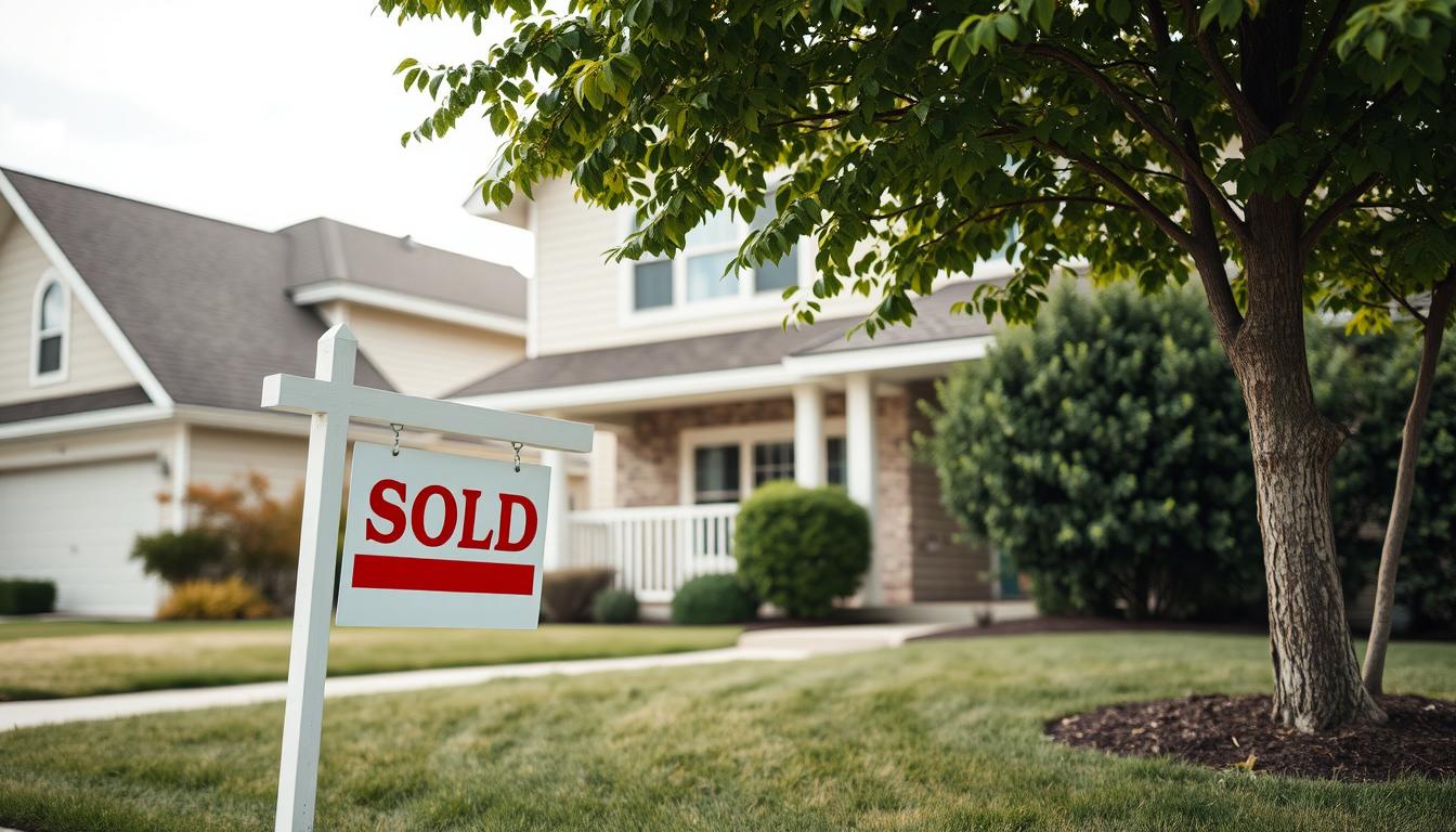 A house with a Sold sign in front of it. A large tree shades the lawn.