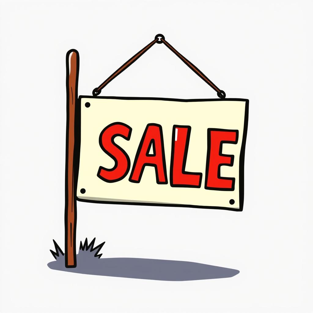 A cartoon sign with the word Sale written on it is hanging from a pole.