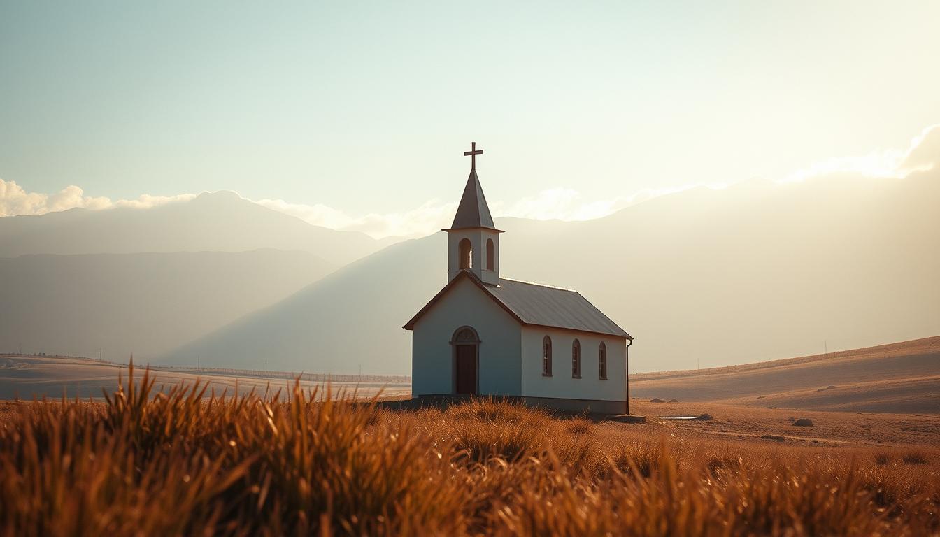 A white church with a steeple sits on a hill, overlooking tall grass fields at sunset, with misty mountains in the background