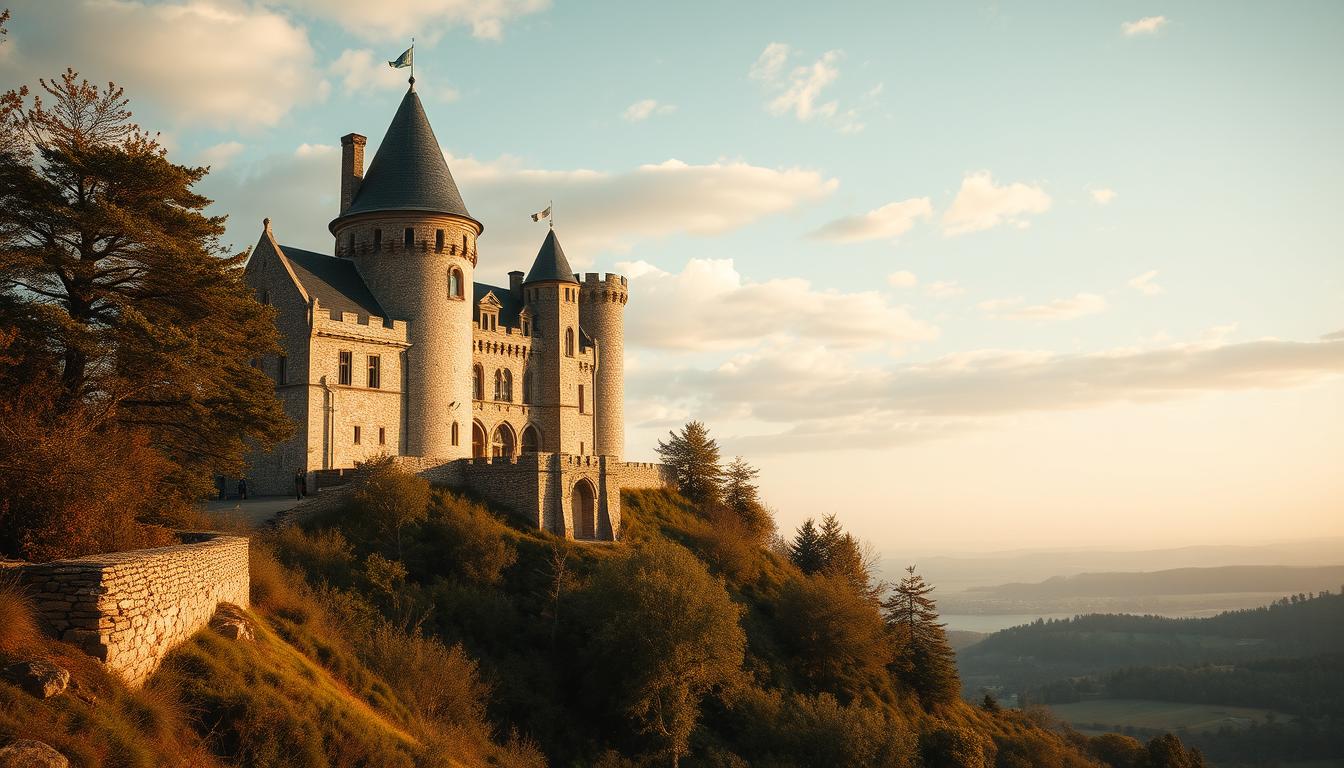 A stone castle sits atop a hill overlooking a valley. The sun is setting behind the clouds, casting a warm glow over the scene.
