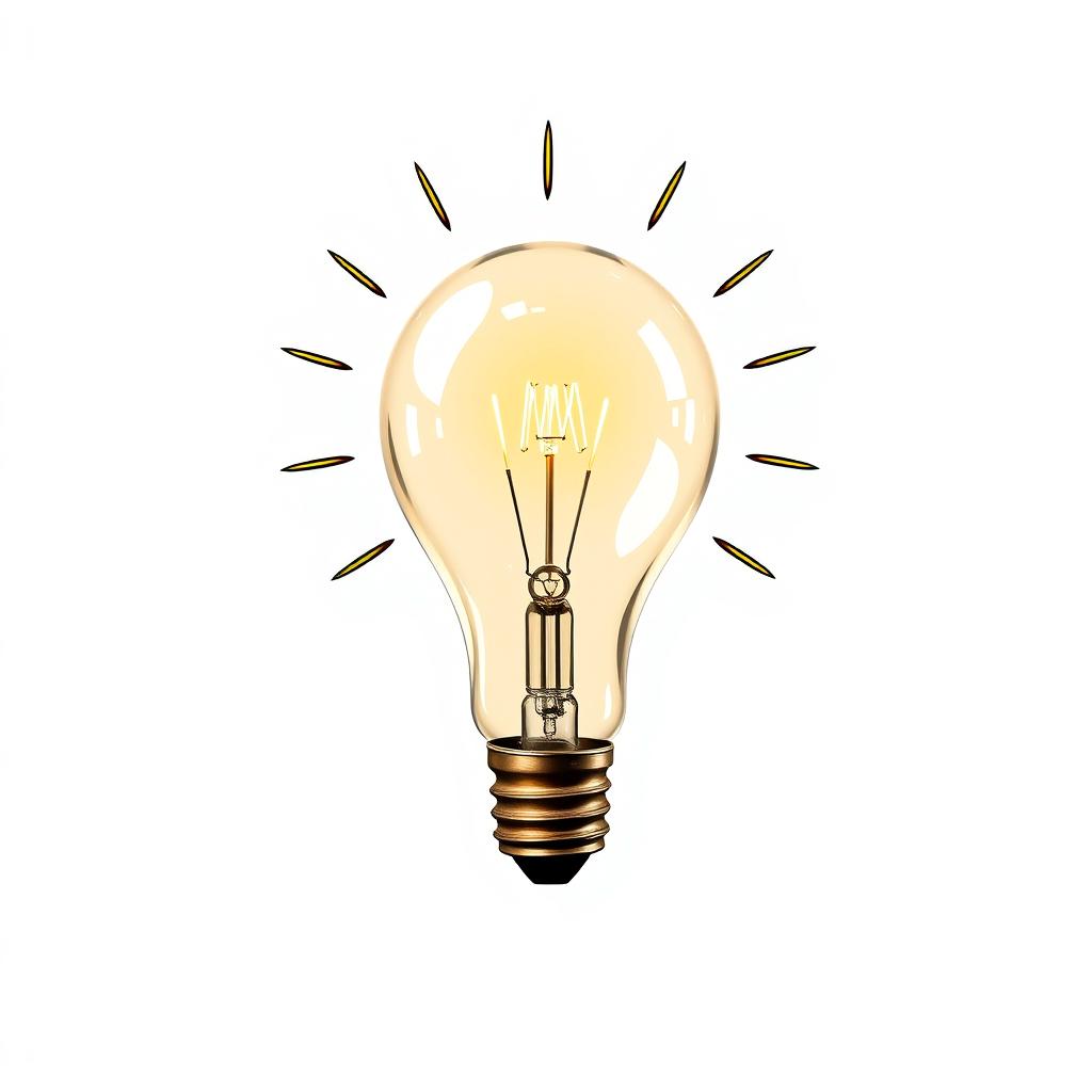 A lit lightbulb with a shining filament and a golden base is isolated on a white background. The bulb is surrounded by a halo of light rays.