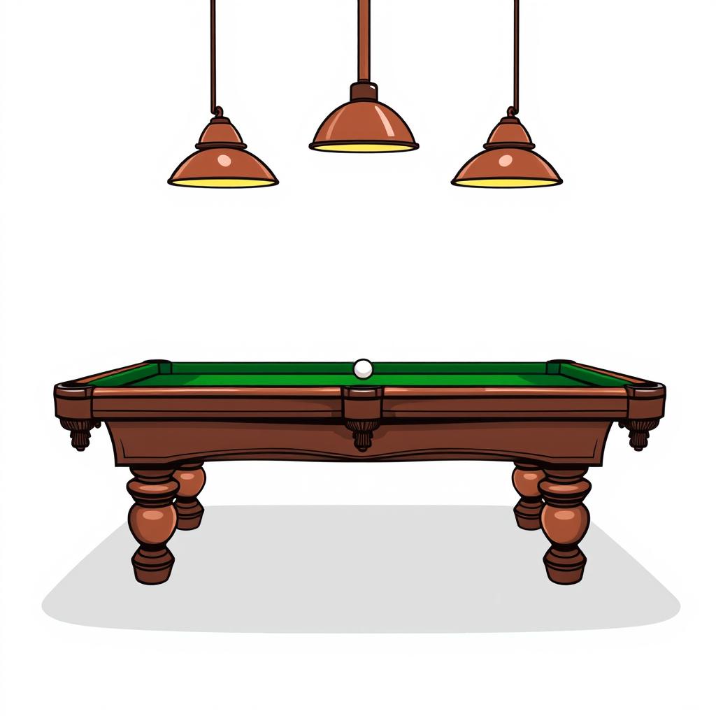 A brown pool table with a green felt surface and three overhead lights. A white ball sits in the center of the table.