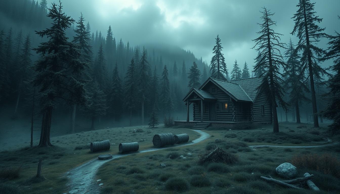atmospheric, cabin, dark, eerie, fog, forest, landscape, mist, moody, mysterious, nature, peaceful, quiet, remote, scenery, secluded, tranquil, trees, woodland, woods