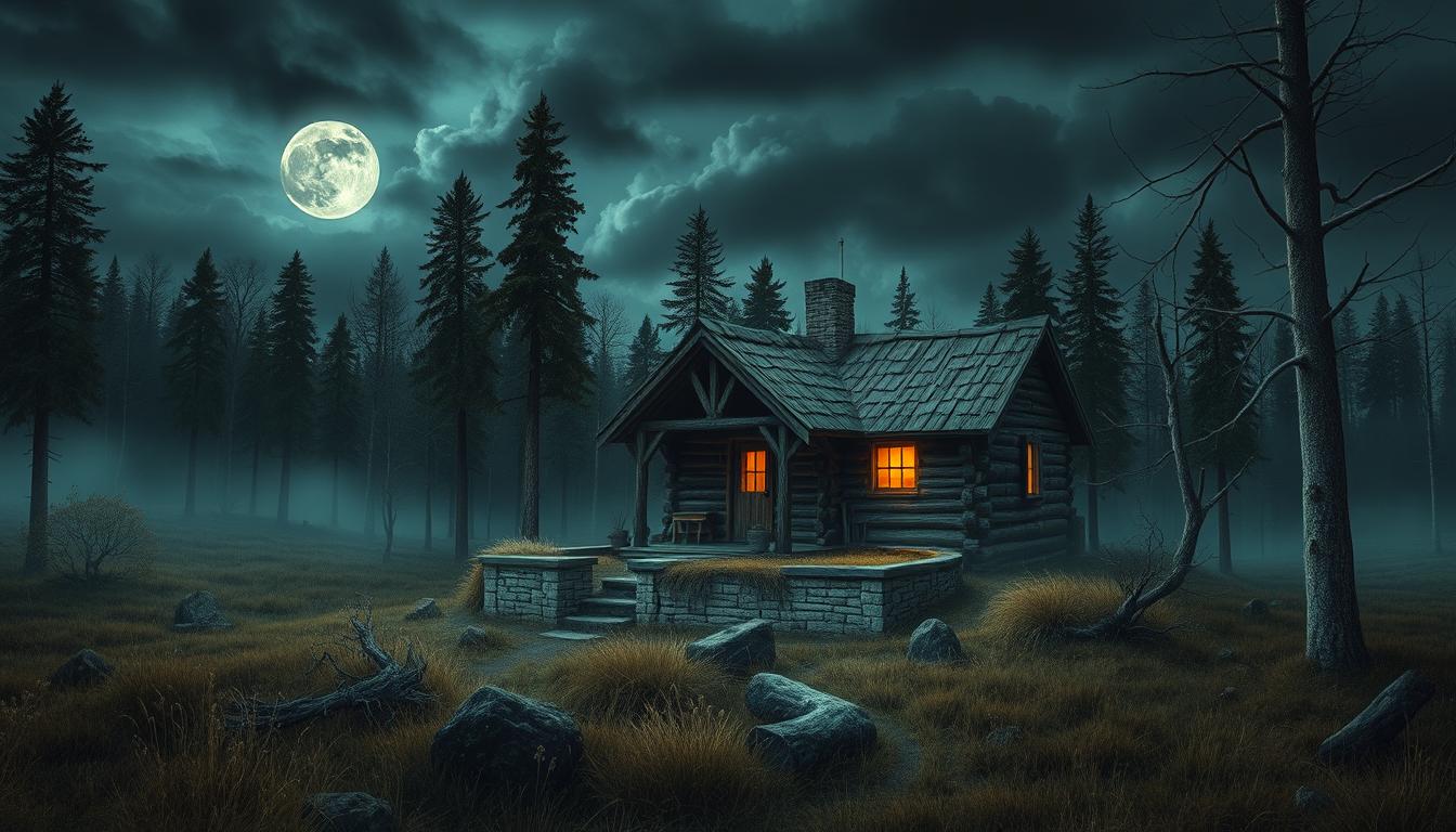 A small cabin glows in a moonlit clearing of a dark forest, casting long shadows from the trees