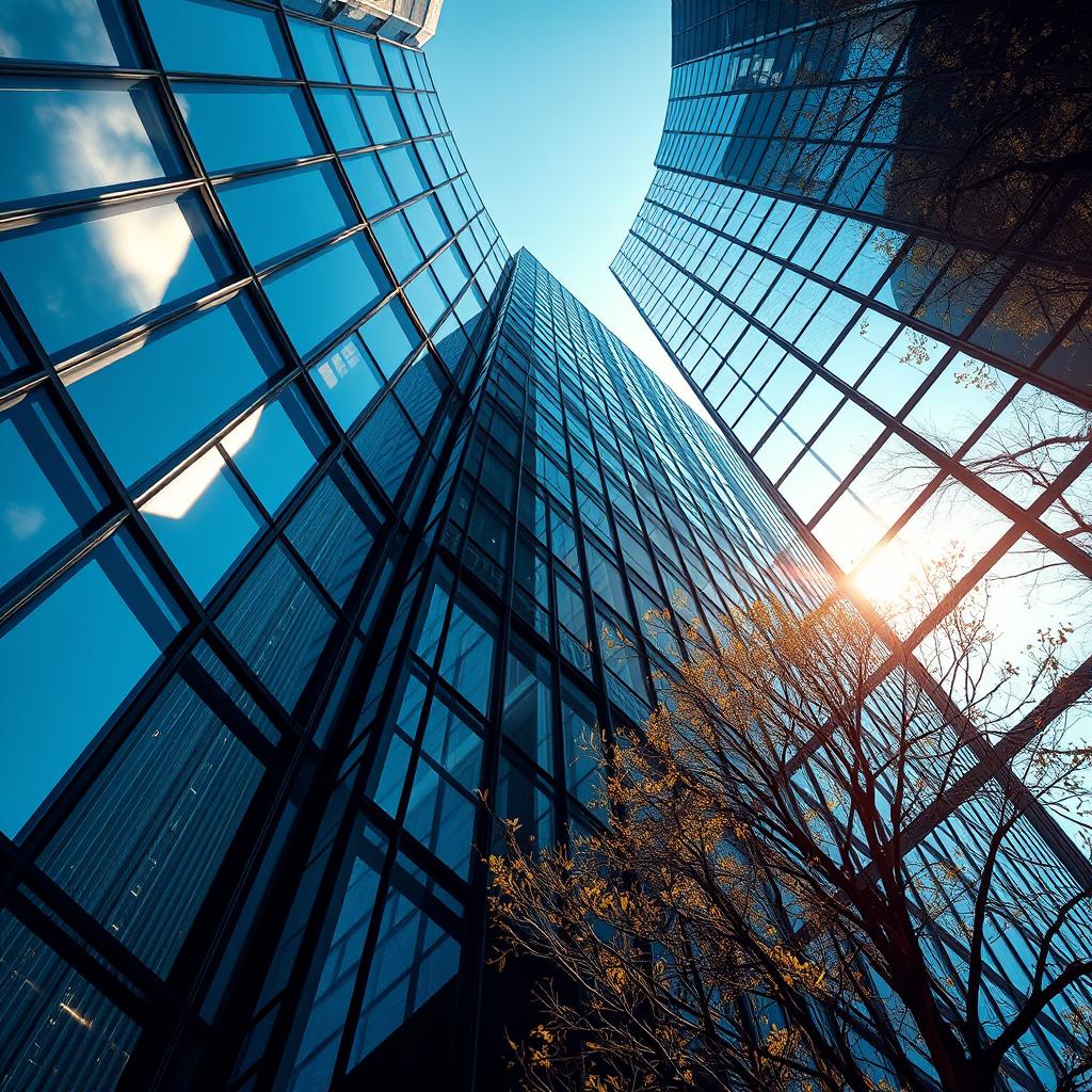 architecture, blue, branch, building, city, cityscape, downtown, facade, glass, high-rise, metropolis, modern, reflection, sky, skyscraper, structure, sunlight, tree, urban, window