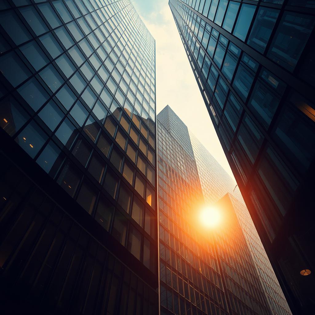 A low angle view of skyscrapers in a city, with the sun shining brightly between them.