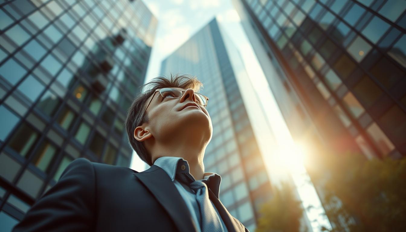 A businessman in a suit and glasses looks upwards at a tall skyscraper.