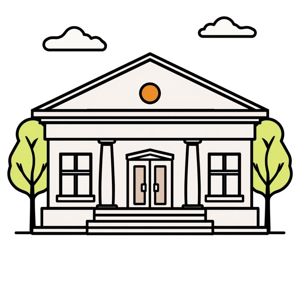 architecture, background, building, circular, clouds, column, day, design, exterior, illustration, pillars, roof, simple, sketch, structure, sunny, tree, trees, white, window