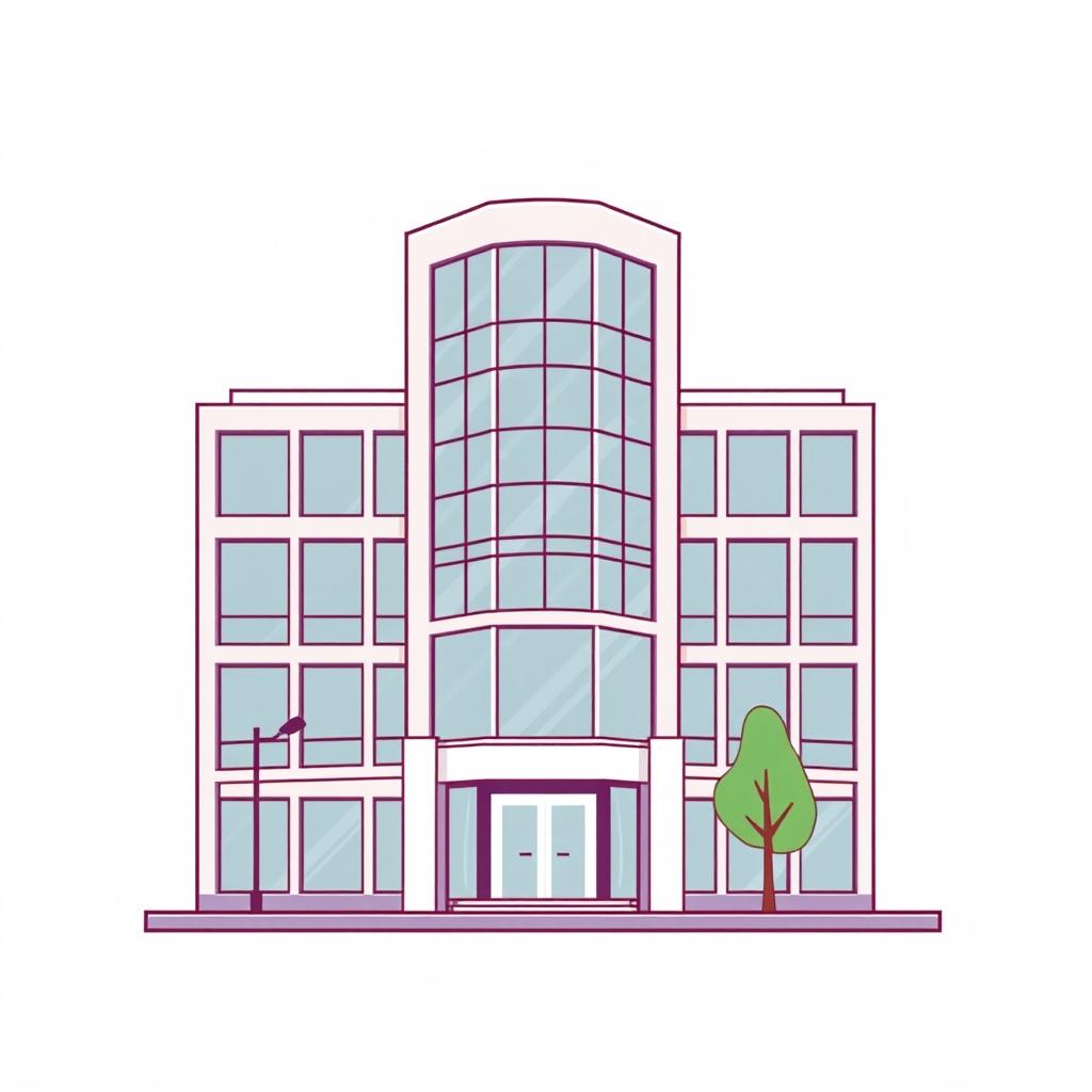 A cartoon drawing of a modern office building with many windows, a door, a street lamp, and a small tree in front of it.