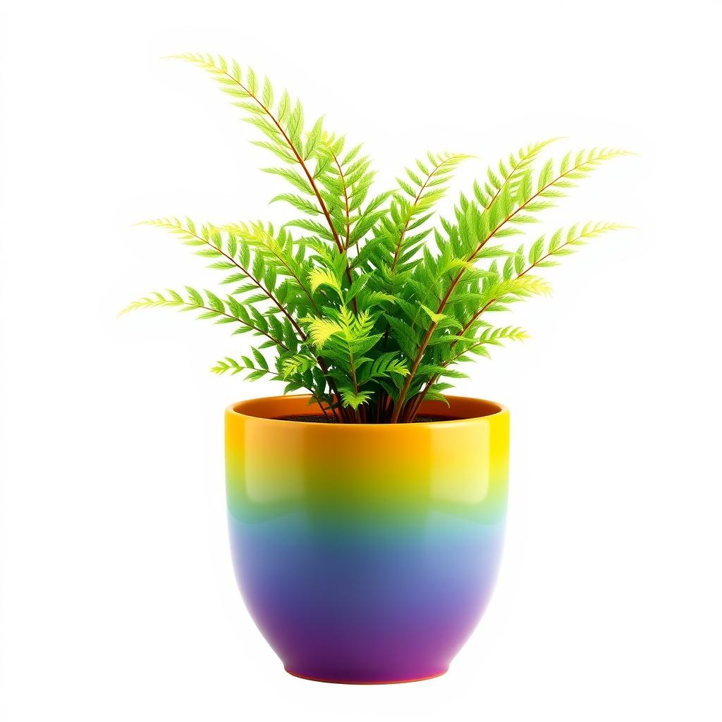 A green fern grows in a round, rainbow ombre pot that transitions from yellow to green, blue, and purple