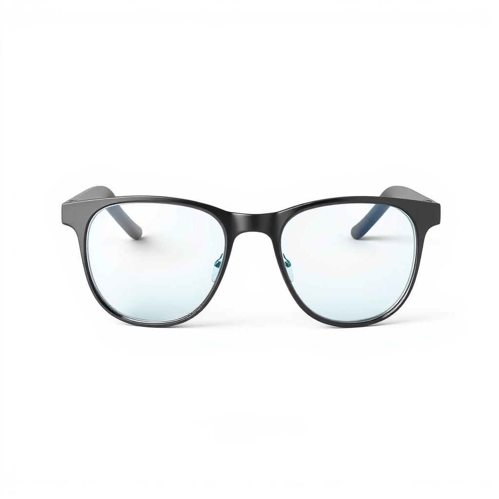 A pair of black framed glasses are on a white background