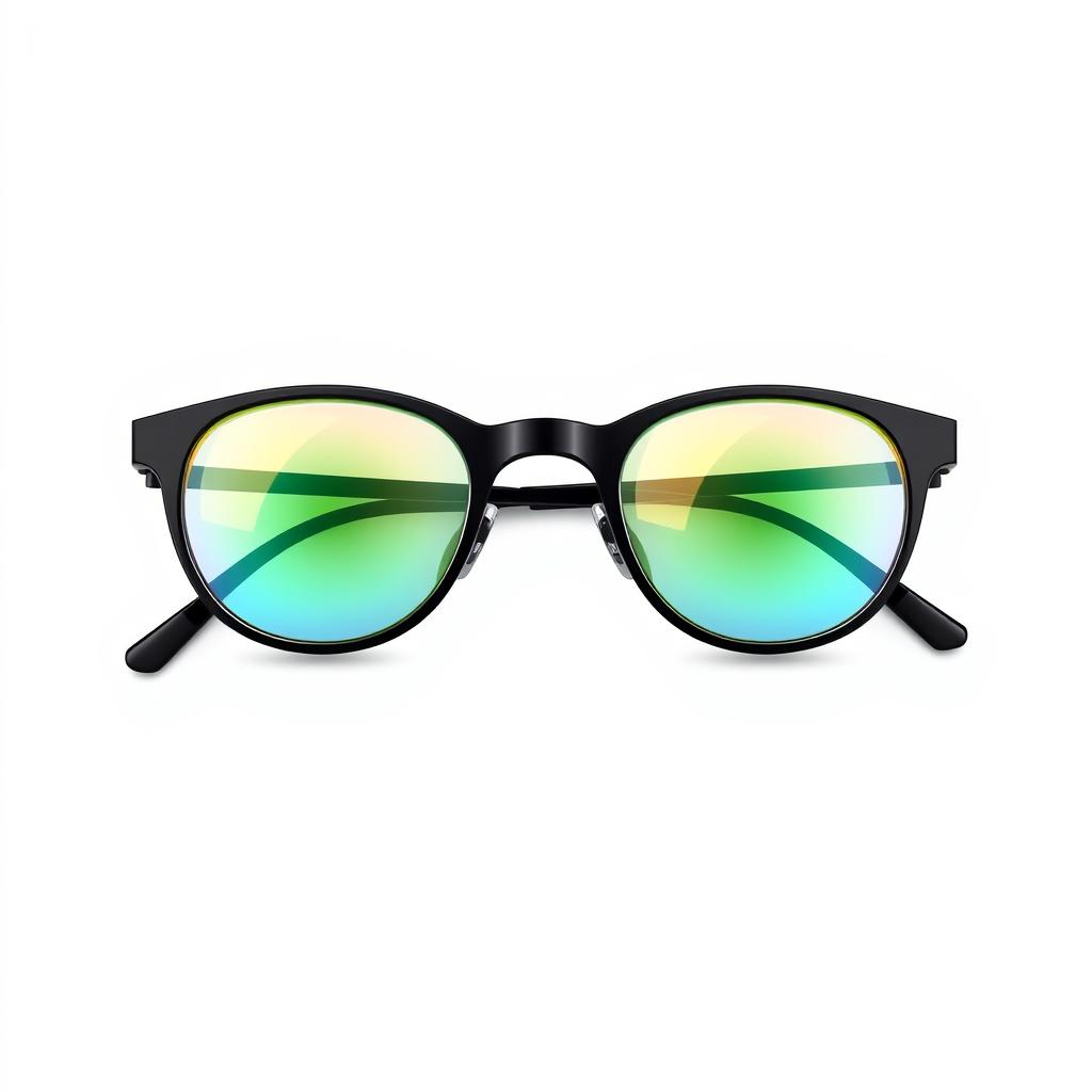 A pair of round, black-framed glasses with green and blue gradient lenses.
