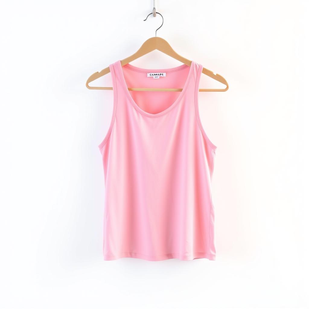 A pink tank top hangs on a hanger