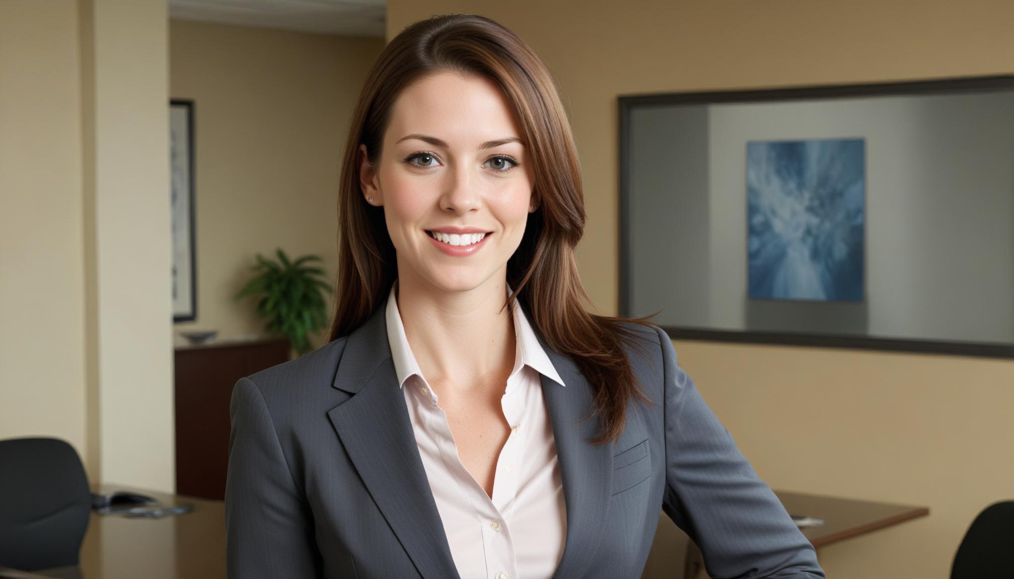 A smiling woman with long brown hair in a blue blazer and white shirt stands in an office with a desk and a painting
