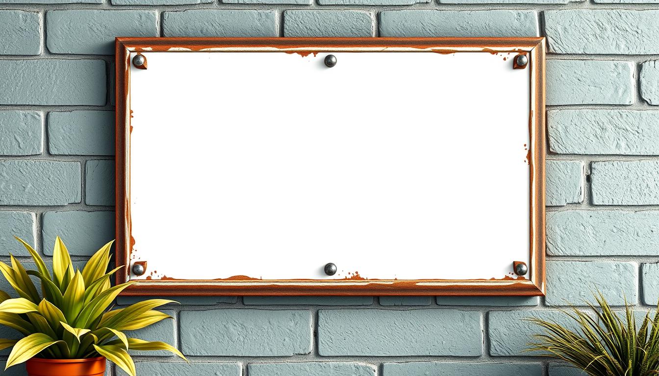 A blank white sign with a brown frame hangs on a light blue brick wall.