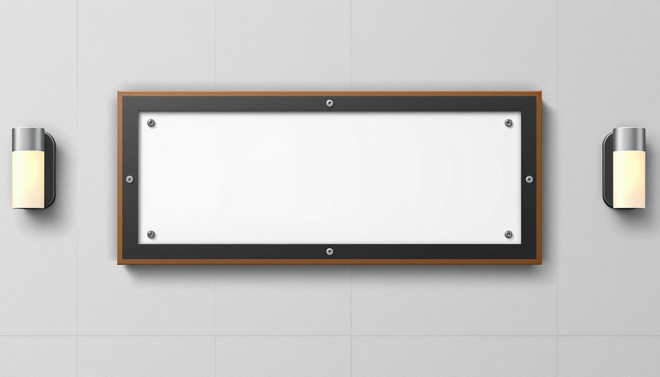 A blank white rectangular sign with a black and brown frame is mounted to a wall, with two rectangular lights on either side.