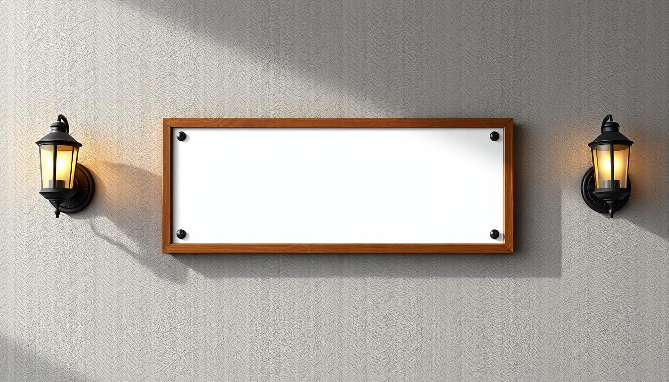 A blank framed sign is mounted to a wall between two lit wall sconces.