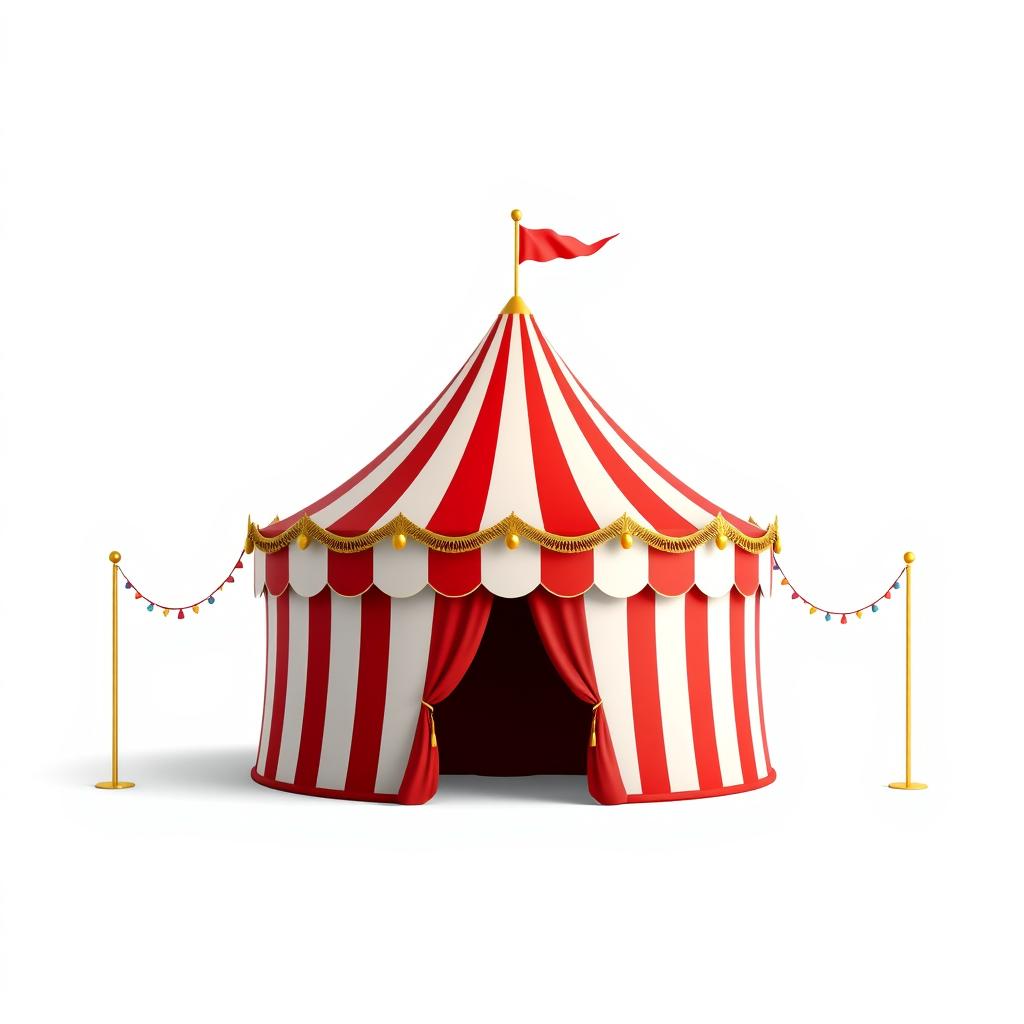 A red and white striped circus tent stands on a white background. The tent has a flag on top and gold trim.