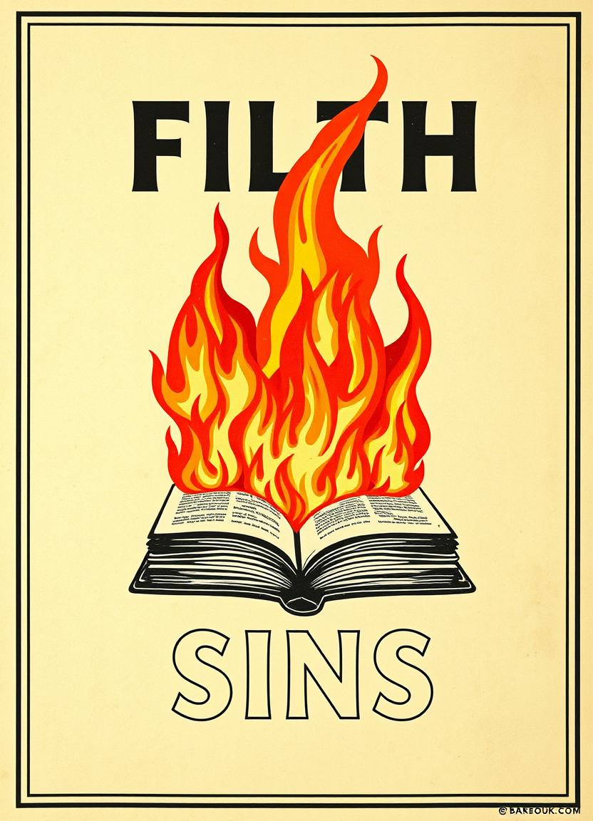 A book is on fire with filth sins printed above it