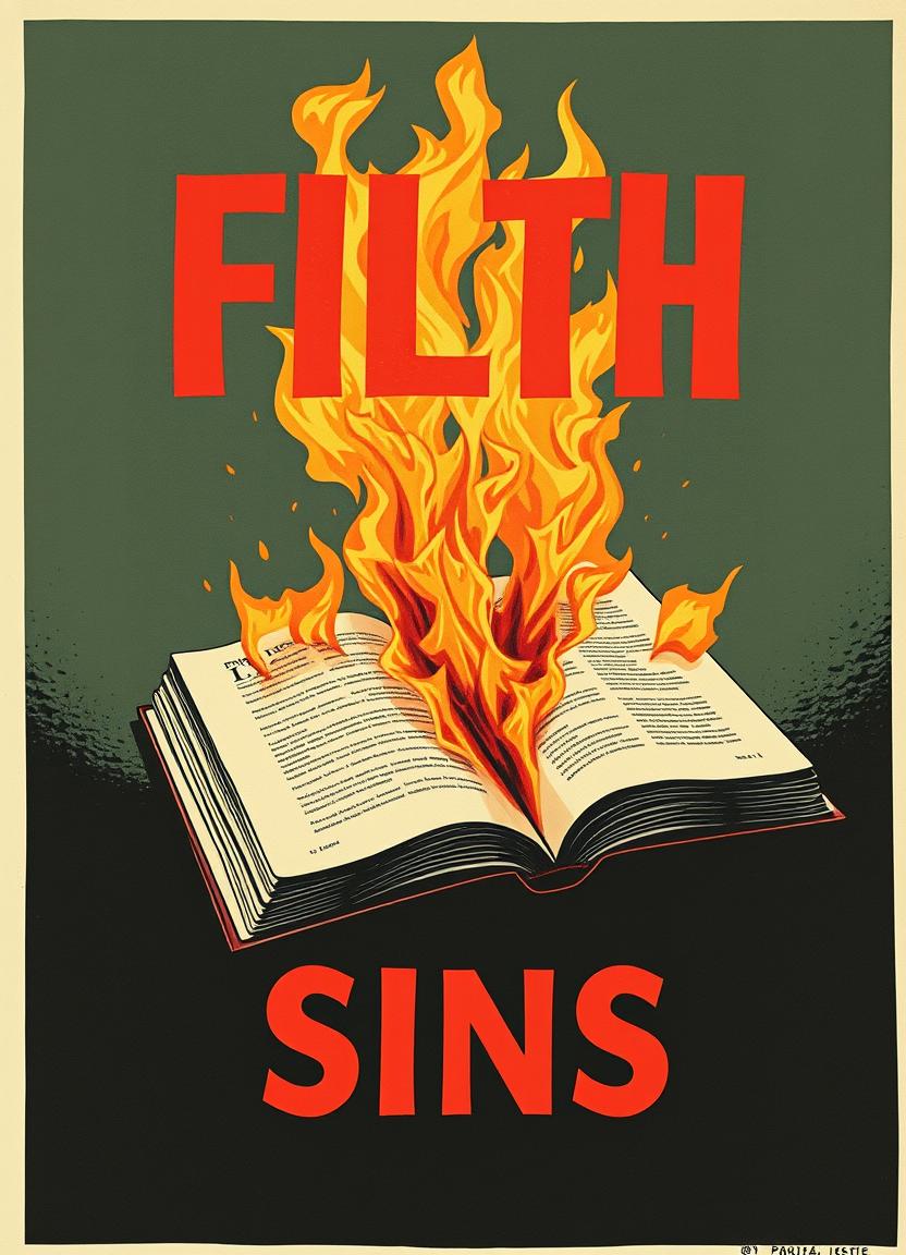 art, artwork, book, burning, design, filth, fire, flames, graphic, green, illustration, open, pages, poster, propaganda, red, sins, text, words, yellow
