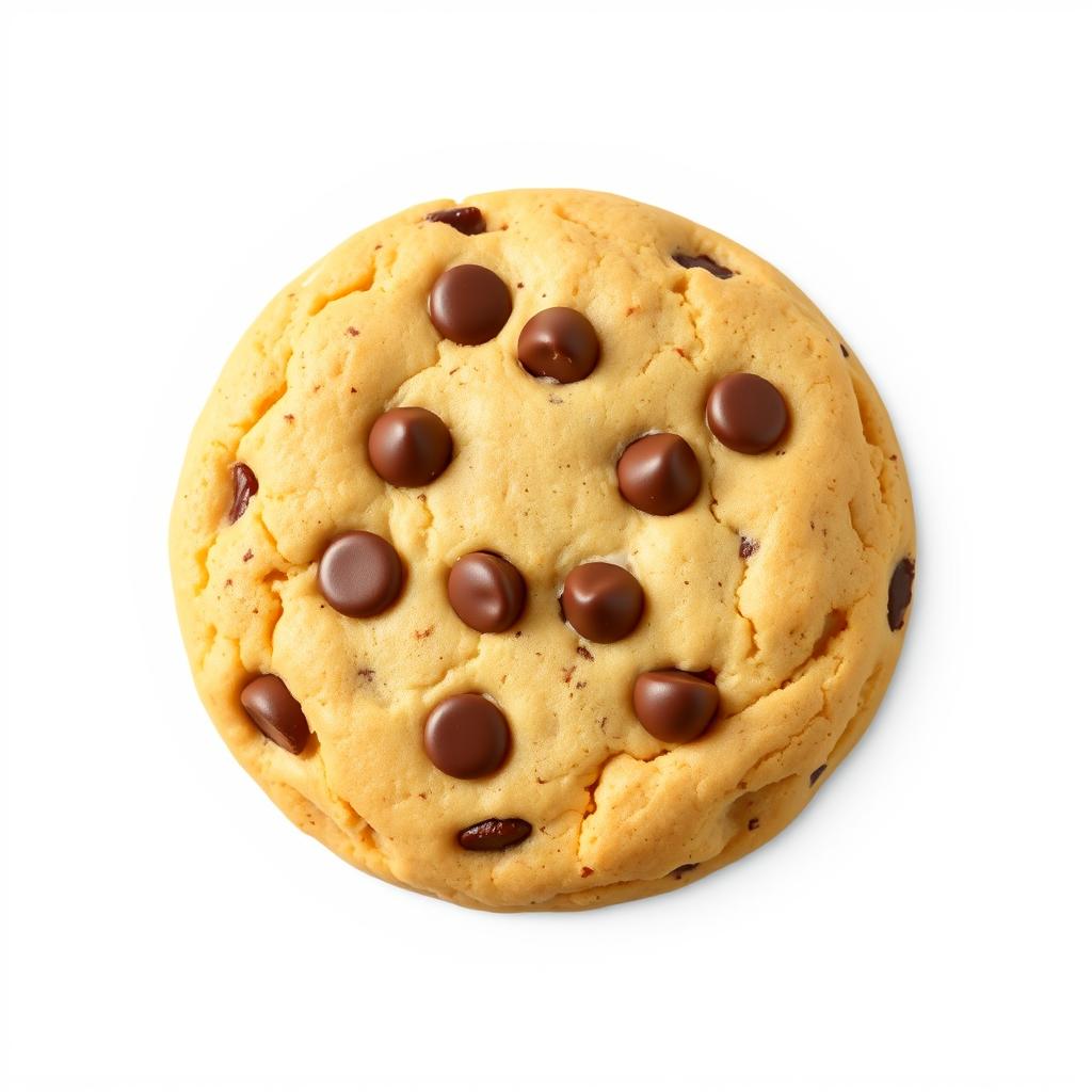 A golden brown chocolate chip cookie sits on a white background, viewed from above, dotted with chocolate chips