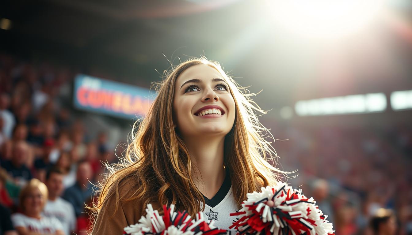 A young woman with long brown hair smiles broadly while holding pom-poms in front of a crowd.