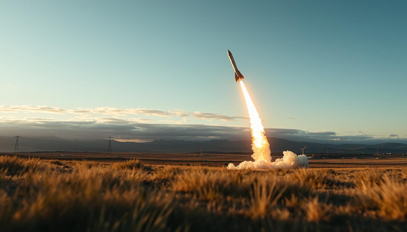 A rocket launches from a field at dusk, with a trail of fire and smoke behind it.