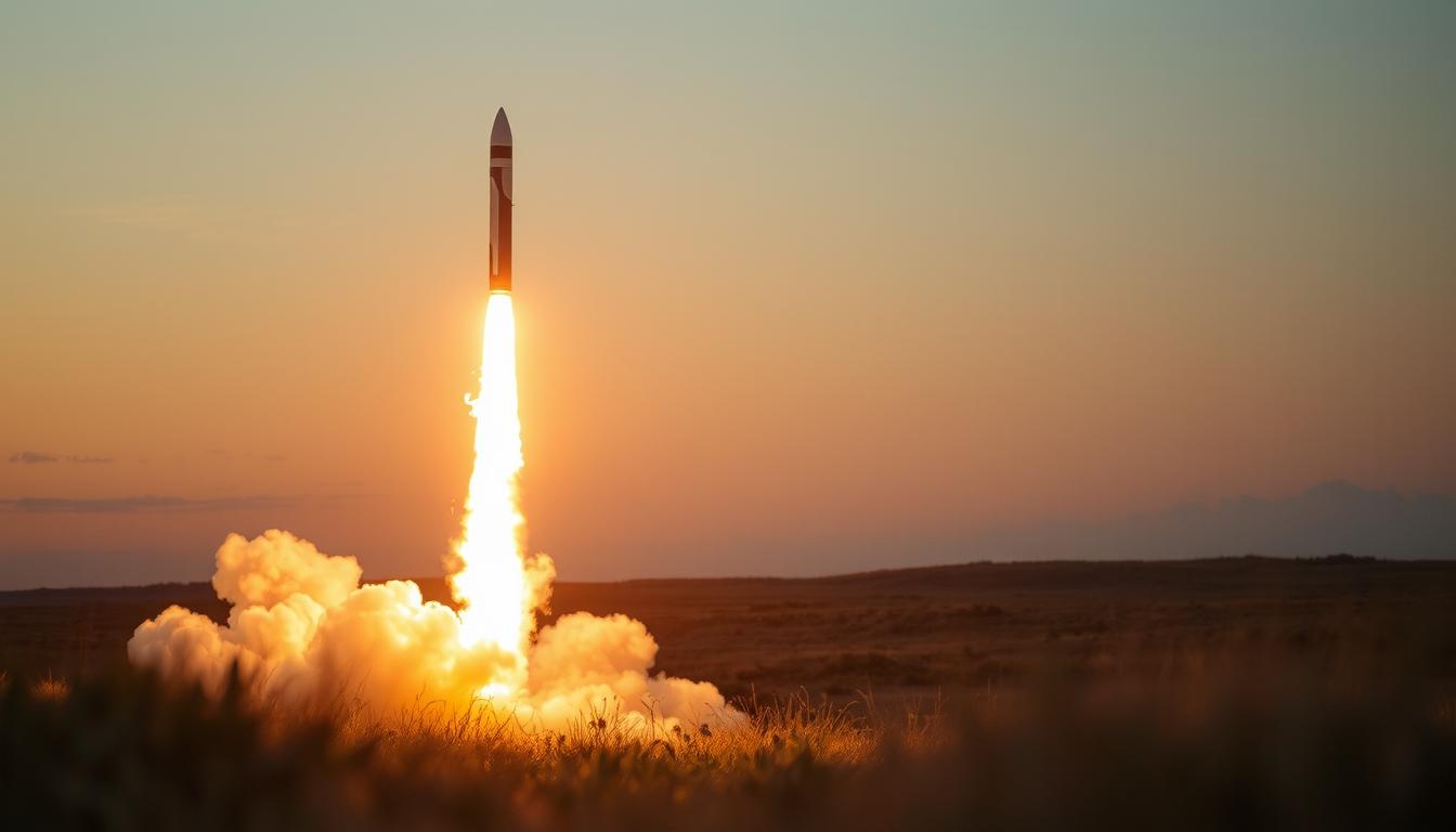 A rocket launches at sunset