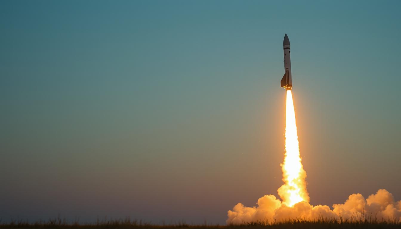 A rocket launches into the sky at dusk