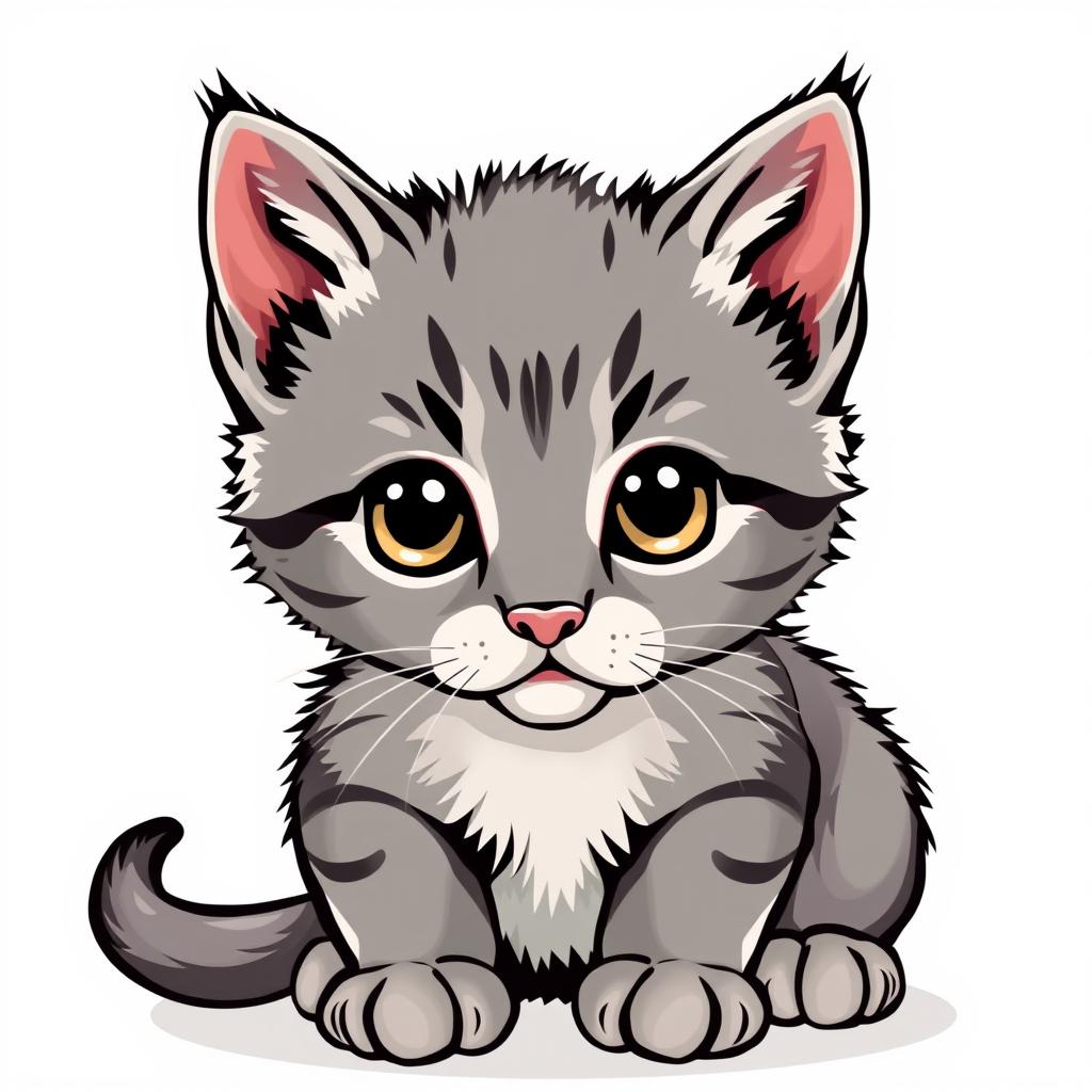 A cartoon gray kitten with big brown eyes, pink ears, and a white chest patch is sitting with its legs tucked under