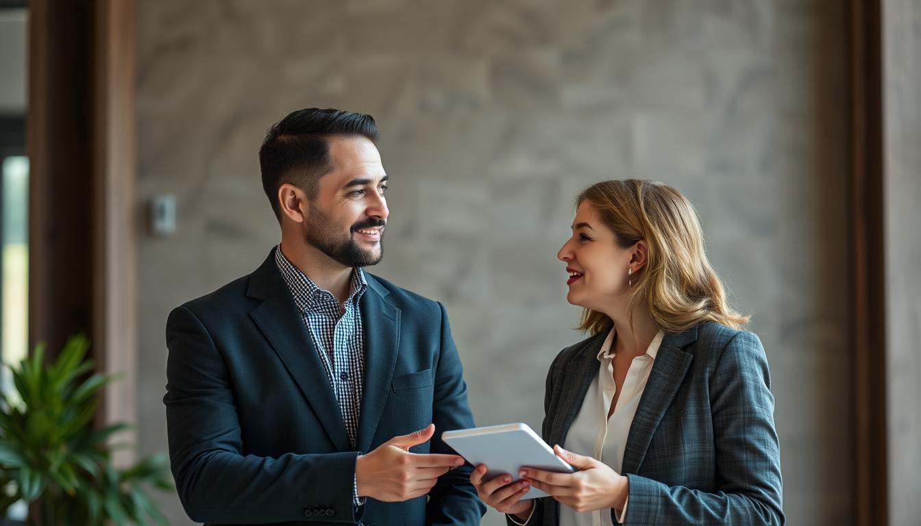 A man and a woman in business attire are standing in an office, looking at a tablet.