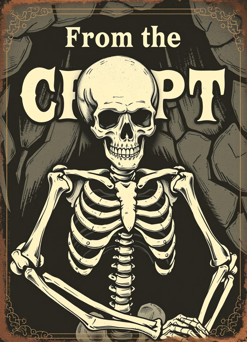 A white skeleton with a large skull sits in a dark cave, arms crossed, amidst gray rock formations and decorative corner details