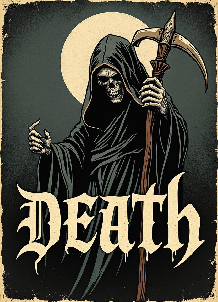 A drawing of the Grim Reaper in a black robe, holding a scythe and standing under a full moon.